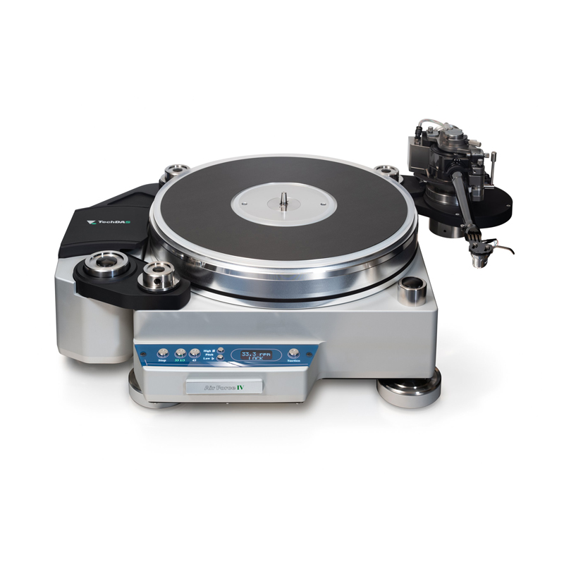 Như mong đợi với một máy quay đĩa của Không quân, mâm đĩa than TechDAS Air Force IV mới này có hệ thống ổ trục khí TechDAS giúp cô lập đĩa quay 9kg, mang đến cho máy quay đĩa “sàn có độ ồn cực thấp”. Mặt trên của đĩa được xử lý bằng một miếng đệm mỏng đặc biệt làm từ vật liệu giảm chấn và chống tĩnh điện để bảo vệ đĩa, trong khi trục quay thuôn nhọn hấp thụ mọi sự lắc lư của đĩa LP ở tâm 0%, theo thương hiệu. Wow and Flutter được liệt kê là dưới 0,03%. TechDAS Air Force IV có kích thước tương đối nhỏ gọn là 168 x 420,5 x 368 mm và không lớn hơn nhiều so với TechDAS Air Force V nhỏ bé, có kích thước là 168 x 312 x 368 mm. Tuy nhiên, sản phẩm mới này lưu trữ động cơ đồng bộ AC 4 cực, 2 pha, độ rung thấp trong một khung máy riêng biệt 160 x 350 x 270 mm, nặng 9kg để cách ly, cải thiện tỷ lệ tín hiệu trên nhiễu của thiết bị. Đai truyền động bằng sợi polyester đánh bóng bề mặt rộng 4mm giống như loại được sử dụng cho các mẫu máy cao cấp hơn.