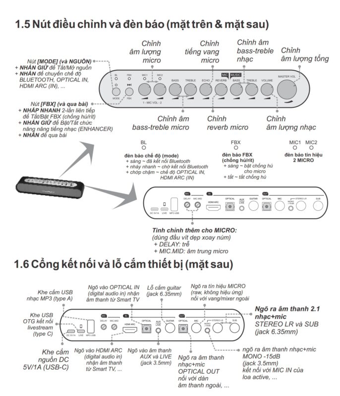 - Kết nối đa năng: AUX, Guitar, Optical/HDMI ARC, Bluetooth 5.0, FM transmitter 87.6-107MHz (karaoke ô tô).
