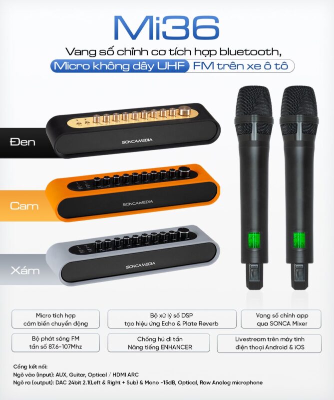 Bạn đang tìm vang số Acnos Mi36 chính hãng – bộ vang số chỉnh cơ tích hợp micro không dây UHF cao cấp nhất 2026? Acnos Mi36 (hay Soncamedia Mi36) là giải pháp karaoke all-in-one siêu gọn, phù hợp hát tại nhà, ô tô, livestream YouTube/TikTok/Facebook. Sản phẩm nâng cấp mạnh mẽ từ Mi30S, kết hợp vang số DSP chuyên nghiệp, Bluetooth 5.0, phát FM cho xe hơi và livestream Type-C chất lượng cao.